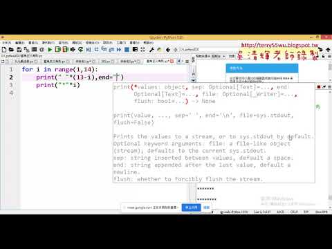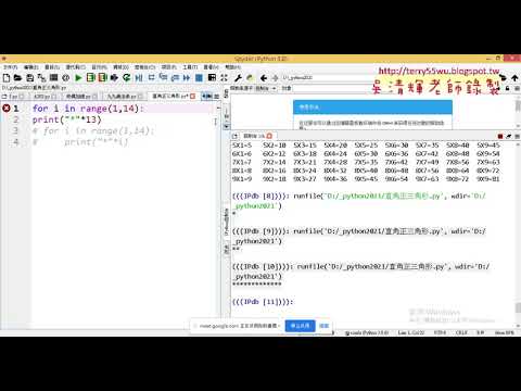 Python基礎程式語言應用證照班第3次上課 01_重點回顧與星號輸出三角形 02_星號輸出正向與反向三角形 03_字串輸出用雙重迴圈與加空白 04_直角三角形改為等腰三角形 05_等腰三角形的方法...